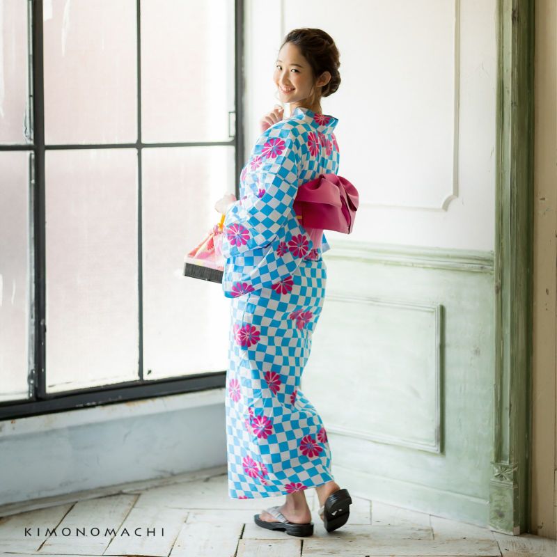 5. 京都きもの町オリジナル浴衣単品「水色市松」フリーサイズ 綿浴衣 お仕立て上がり浴衣 レディース 女性用 女性浴衣 ゆかた yukata【メール便不可】ss2512ykl10