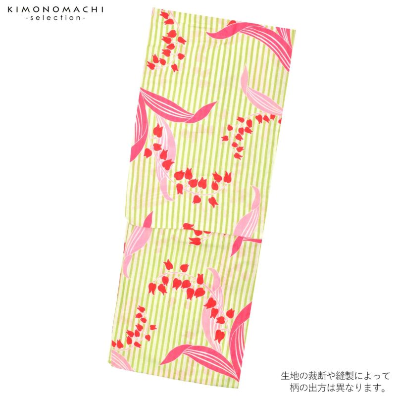 オフホワイトと明るい黄緑色のストライプの地に、抽象的なスズランの模様。ピンクや濃ピンクの葉、赤の花。