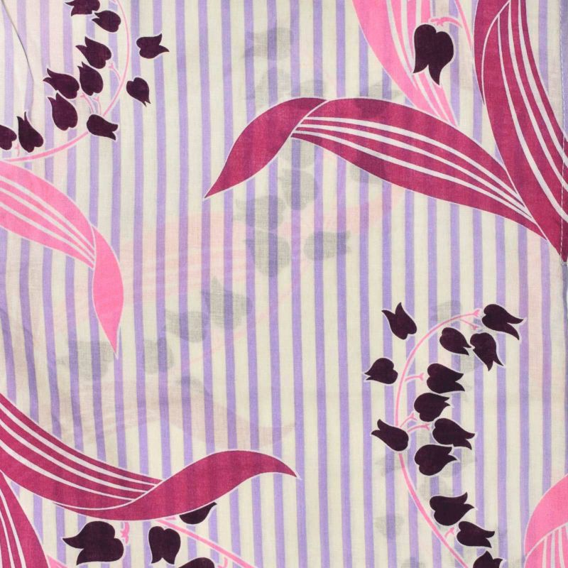 オフホワイトと淡い藤色のストライプの地に、抽象的なスズランの模様。ピンクや赤紫の葉、濃紫の花。