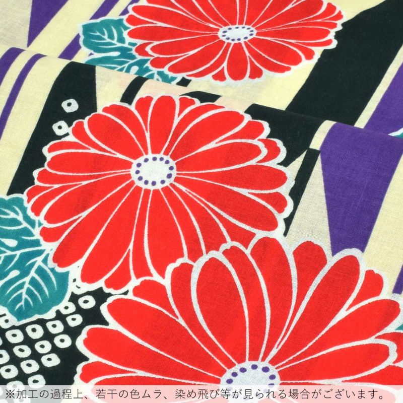 やや黄色みのクリーム色の地に、黒と深い紫の矢羽根の模様、白の鹿の子。赤い菊の花、青緑色の葉。