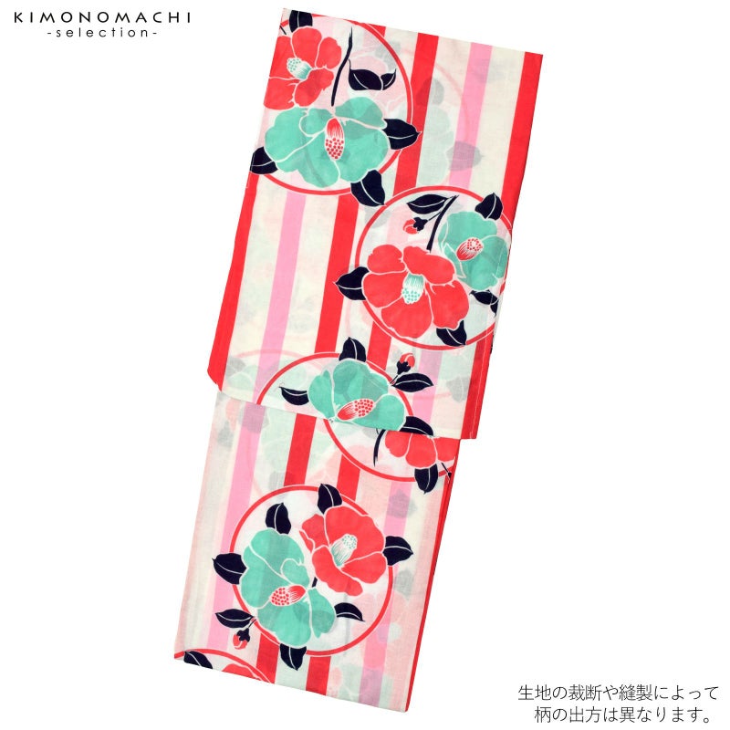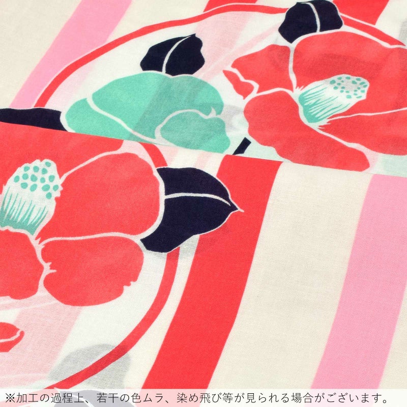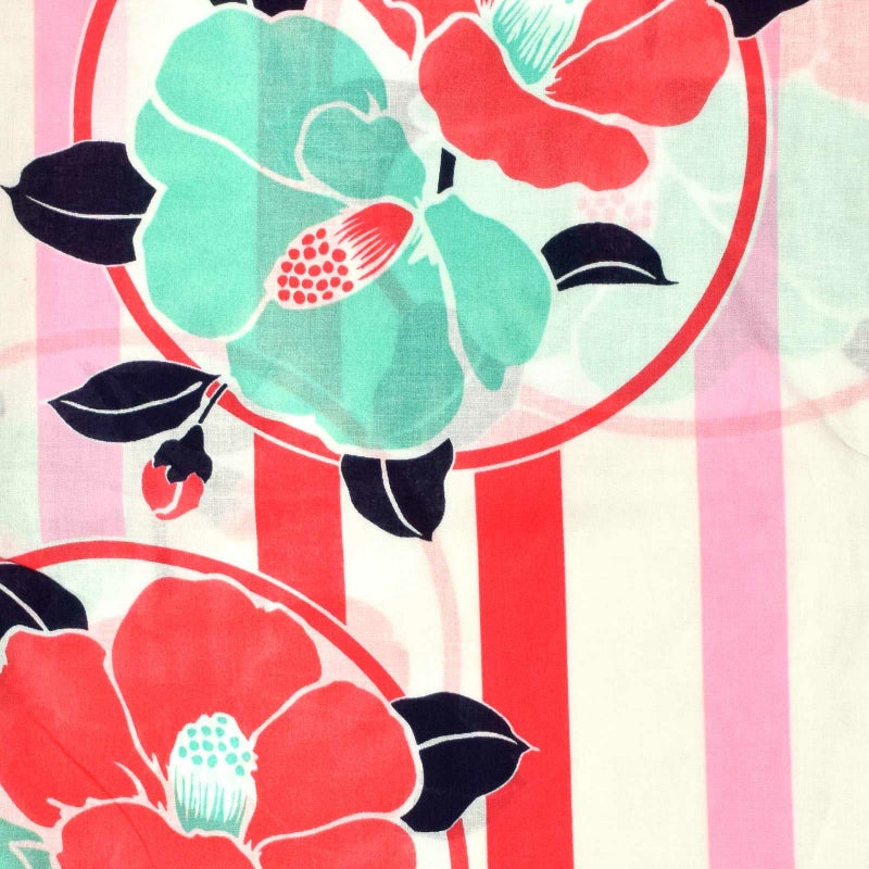 白に淡いピンク、赤みのピンクの大きなストライプの地。赤みピンクの丸に、同色の椿、ミントグリーンの椿、深い紫紺の葉。
