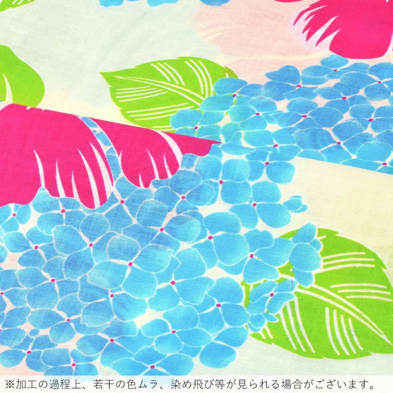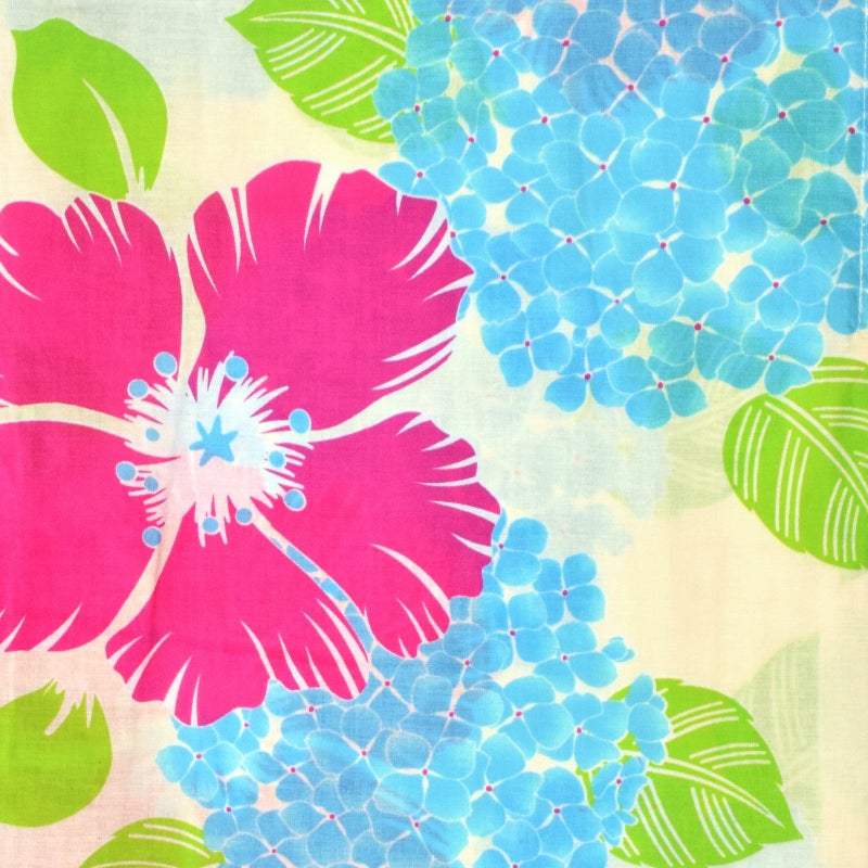 淡いクリーム色の地に、大きな紫陽花や夏のお花の柄。やや濃淡のある水色、中心に赤紫の点の紫陽花。赤紫みのマゼンタピンクの抽象的なお花、水色の蕊。明るい黄緑色の葉。