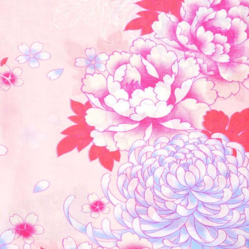 淡いピンク色の地に、菊や牡丹、桜の花柄。白に淡いブルー、深い桃色など。