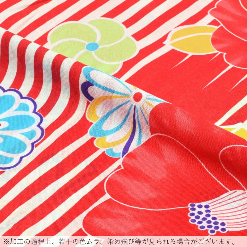 【カラー】オフホワイトと赤のストライプの地に、淡い赤色の椿の花、菊花やねじ梅の模様。水色や明るい黄緑色、深紫、黄色など。