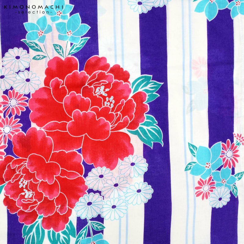 【カラー】オフホワイトと明るい青紫色の縦縞の地に、赤ピンクの牡丹や水色、ピンクの花々の模様。