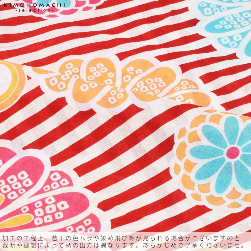 オフホワイトと赤の斜めストライプの地、大輪の菊花やねじ梅を飛ばしたデザイン。明るいオレンジ色、ピンク色、水色の菊花。オレンジ色や黄色、水色のねじ梅。