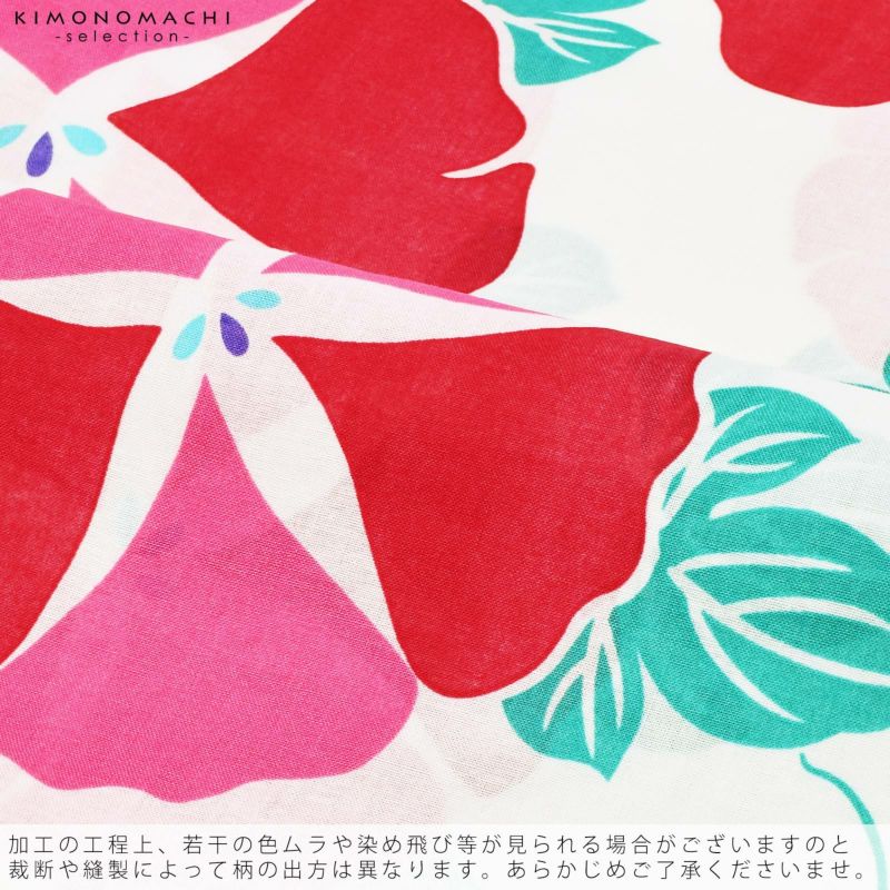 白地に、赤とマゼンタピンクの抽象的な朝顔の花。花の中心に水色、紺のポイント。あざやかな青緑色の蔓や葉。