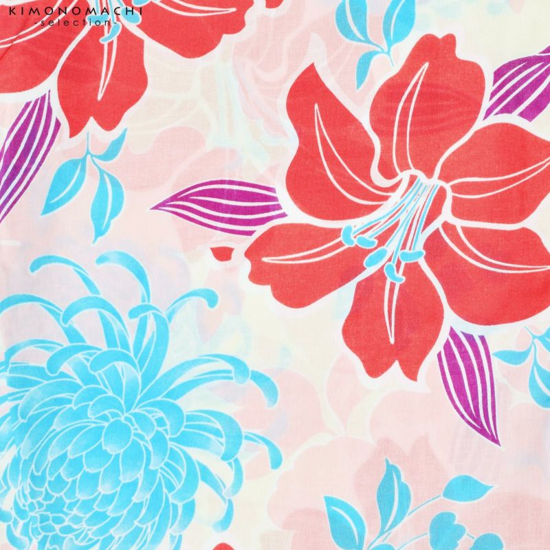 オフホワイトの地に淡いピンク色の花のシルエット。水色の菊、赤の百合の花、紫の葉。