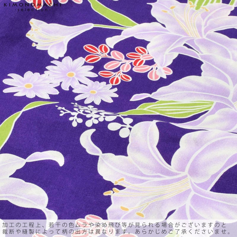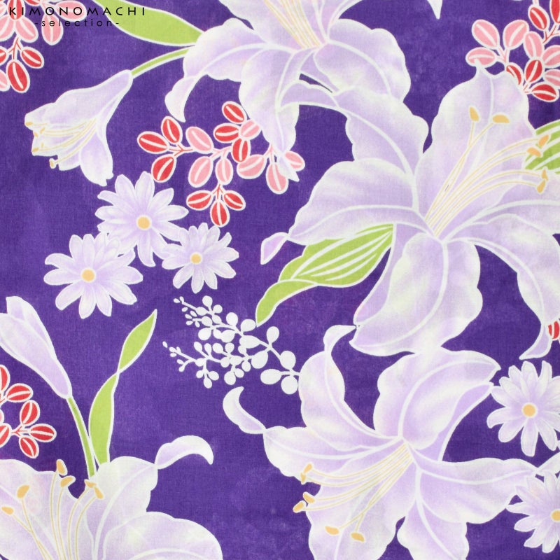 深い青みの紫色の地に、百合や菊、萩など秋草の柄。白に淡い藤色、赤、ピンク、黄色、黄緑など。