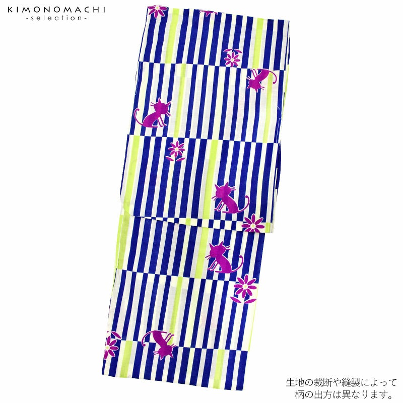 【カラー】オフホワイトと青、明るい黄緑のストライプの地。赤みの紫色の猫やお花。