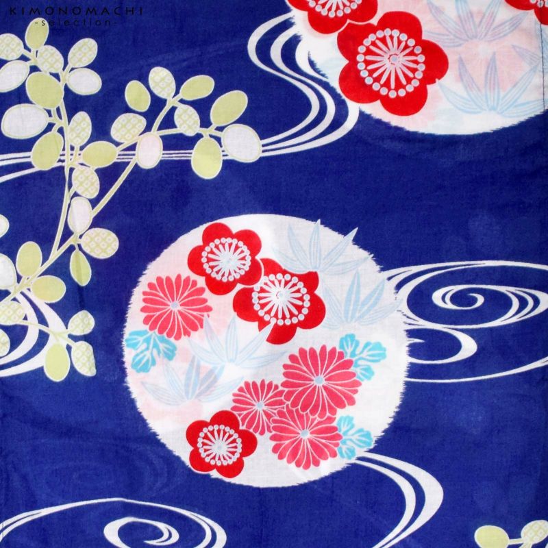 【カラー】あざやかな青地に、白の流水模様、明るい黄緑の萩の葉。白の丸の中に、深い桃色や赤、水色の菊や梅、竹。