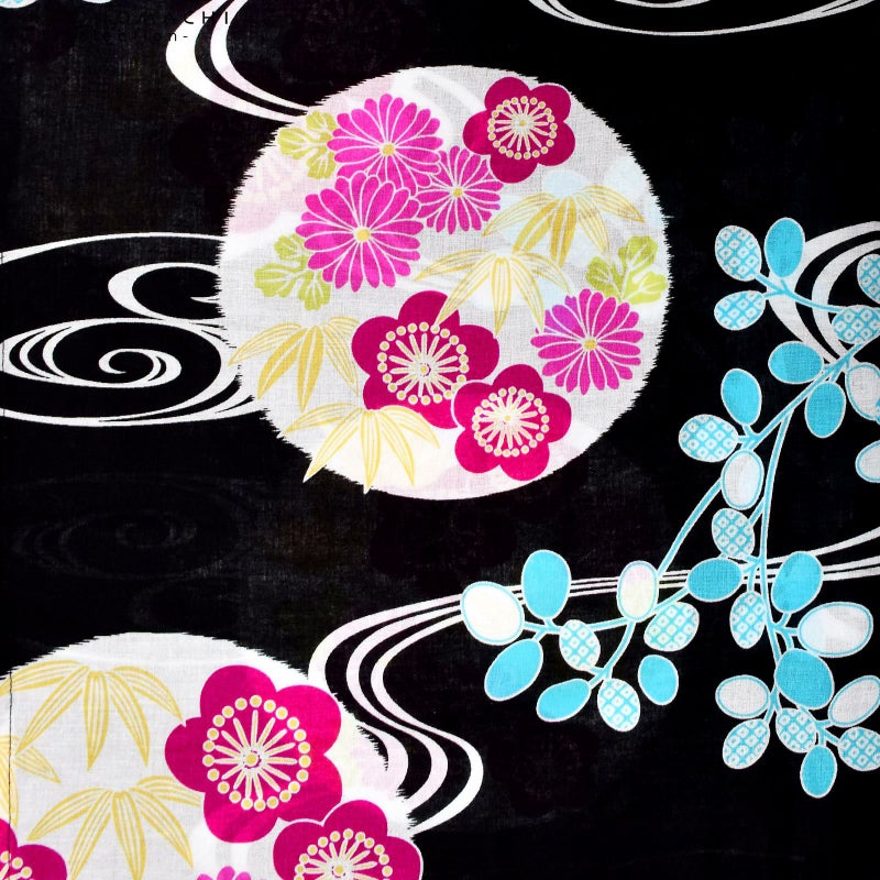 【カラー】黒地に、白の流水模様、明るい水色の萩の葉。白の丸の中に、薄い赤紫色や赤紫、黄色の菊や梅、竹。