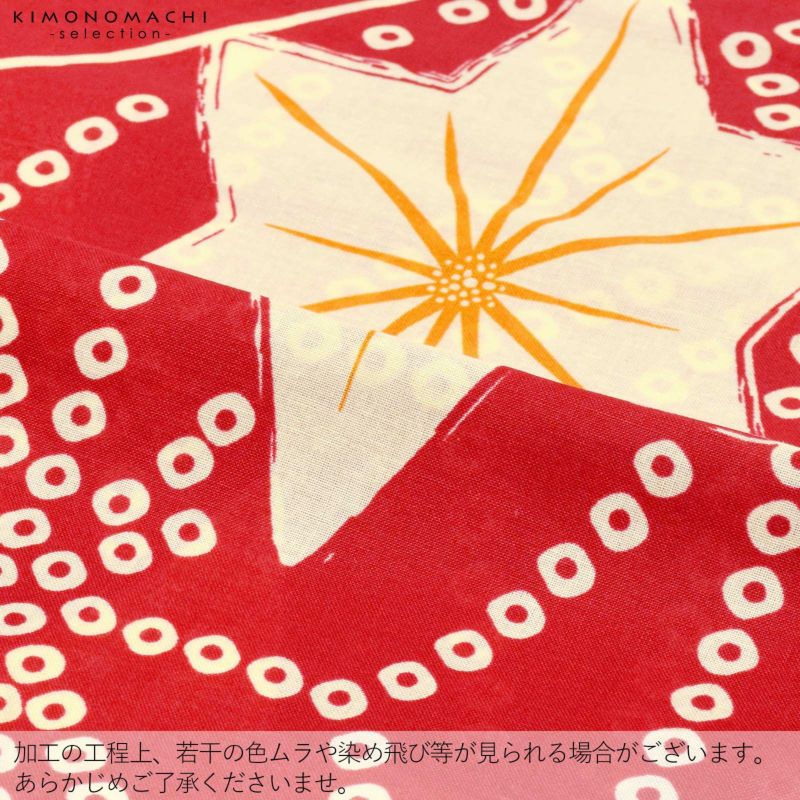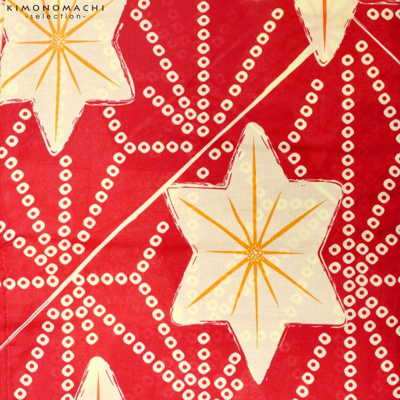 【カラー】深い赤地に、淡い生成り色の鹿の子で表現された麻の葉模様。生成り色の星型の中に、橙色や薄橙色のライン。