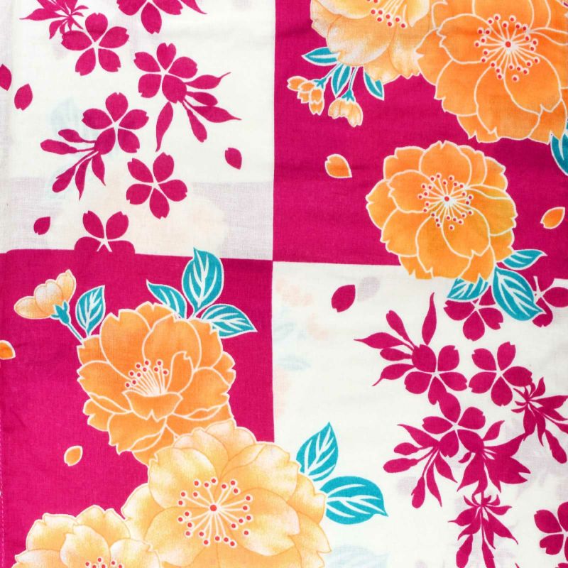 【カラー】オフホワイトと赤紫の長方形の市松模様の地。淡い橙色の八重桜の花。青緑の葉。赤紫色のシルエットで表現された桜。