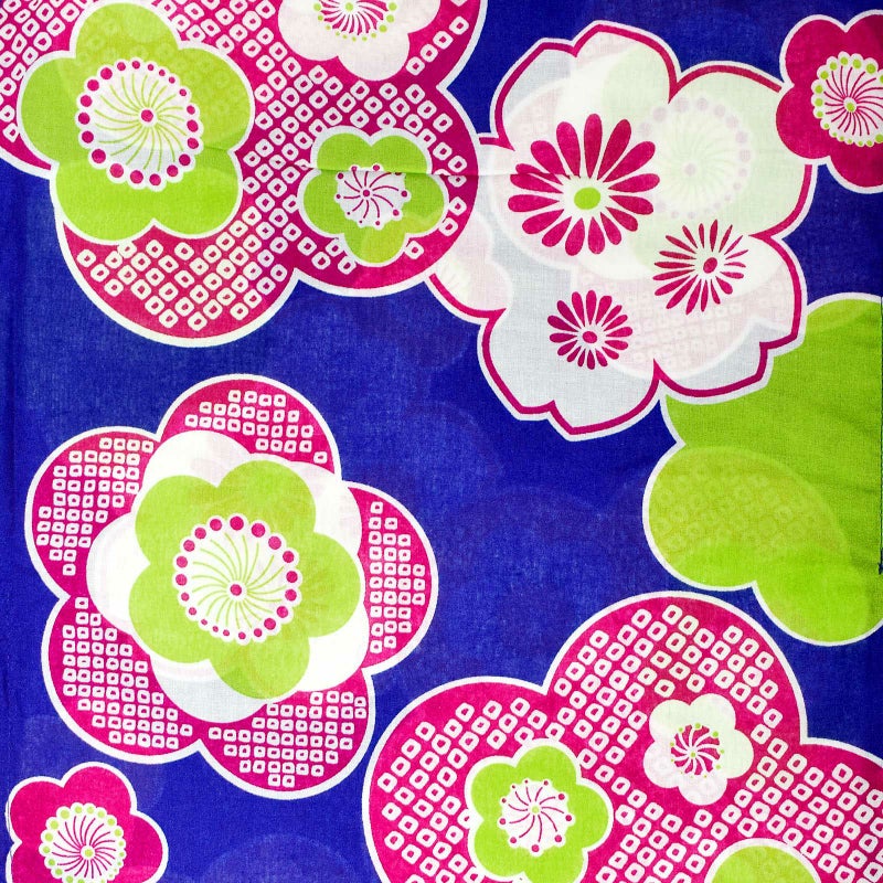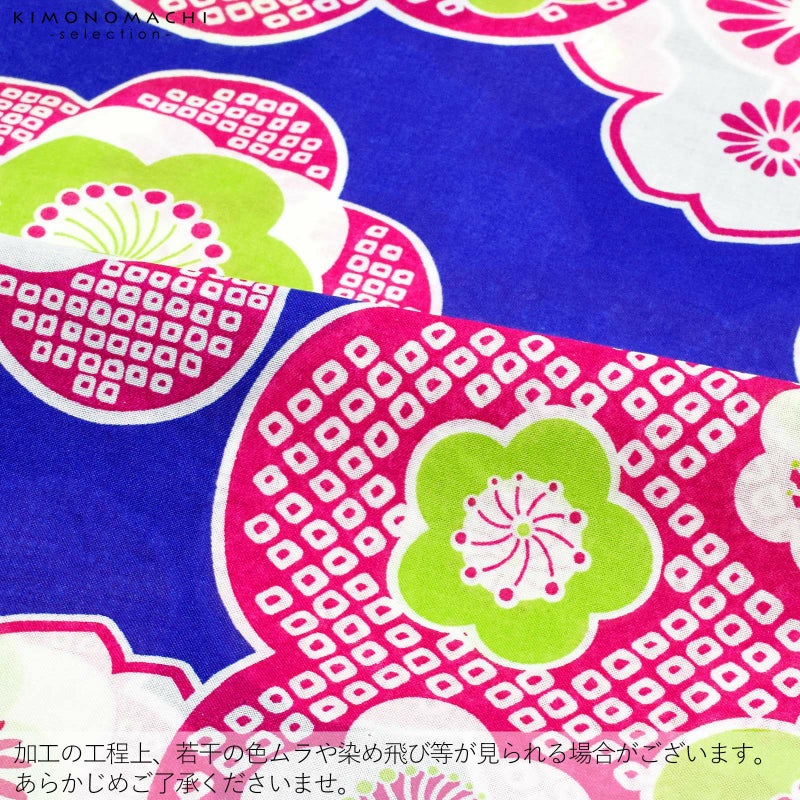 【カラー】冴えた青地に、丸いデザインの梅や桜の花模様。赤紫と白の鹿の子や、菊の花。明るい黄緑色がアクセント。