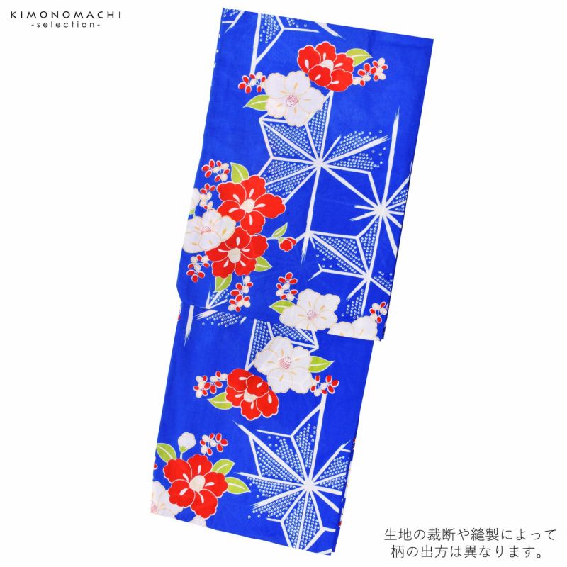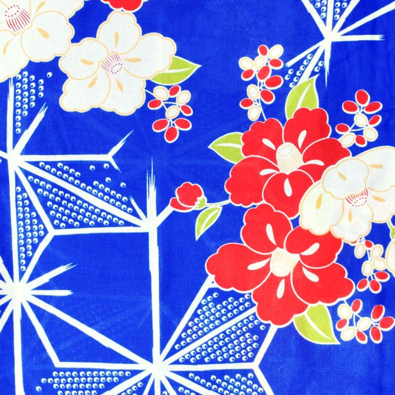 【カラー】青地に白の麻の葉模様。赤や浅い橙に白、黄緑の椿。