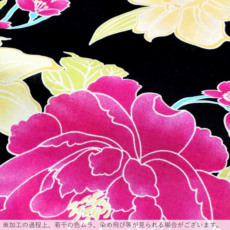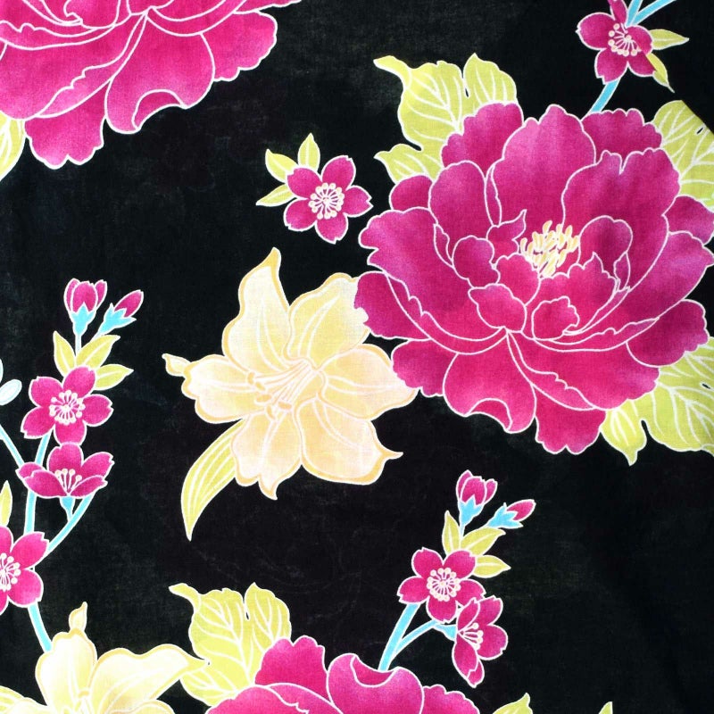 【カラー】黒色の地に、深い赤紫色の牡丹の花、ごく淡い黄色の百合。桜や萩。水色や淡い黄緑色の葉。