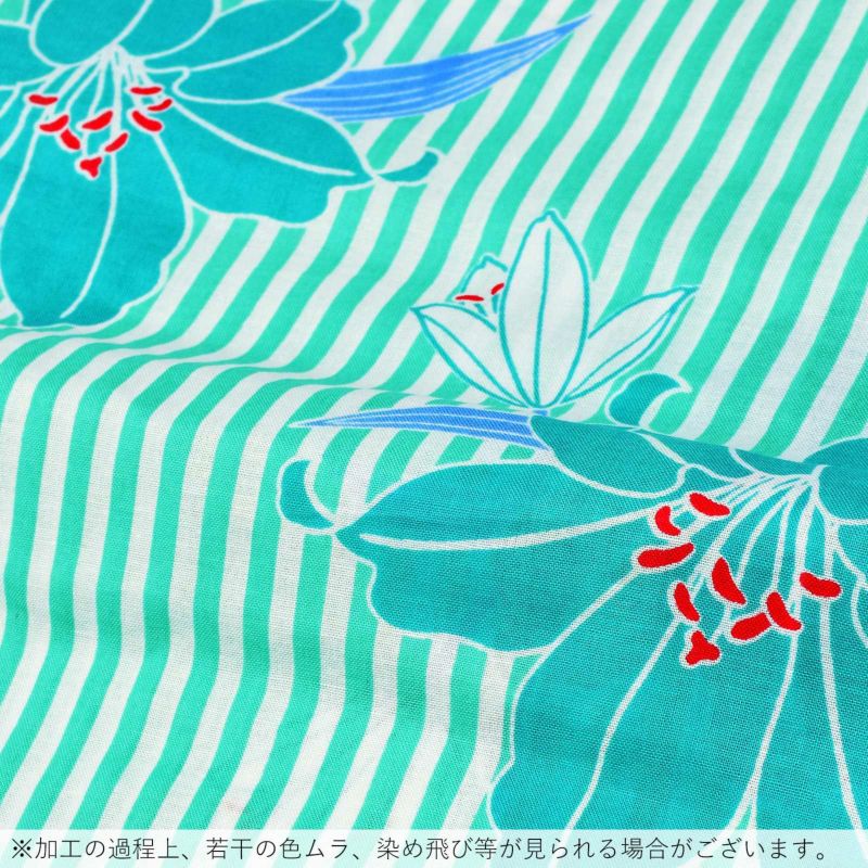 【カラー】白と明るいミントグリーンのストライプの地。白と明るい青緑色の百合の花、浅い青色の葉。