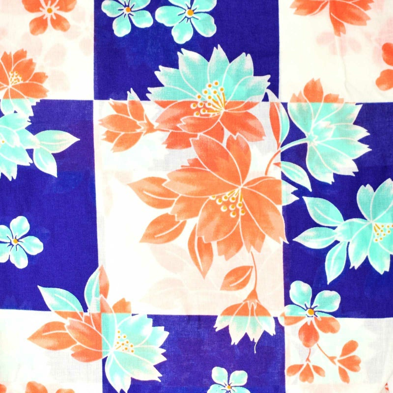 【カラー】深い青とオフホワイトの市松模様の地に八重桜の模様。サーモン系の浅いオレンジ、ミントグリーン。