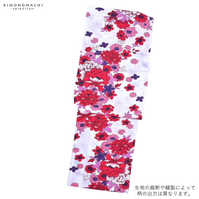 浴衣 レディース 単品 「風香 白地 赤の牡丹と桜」 フリーサイズ yukata 【メール便不可】