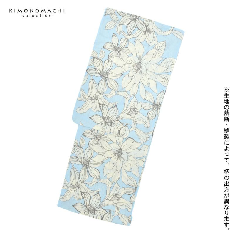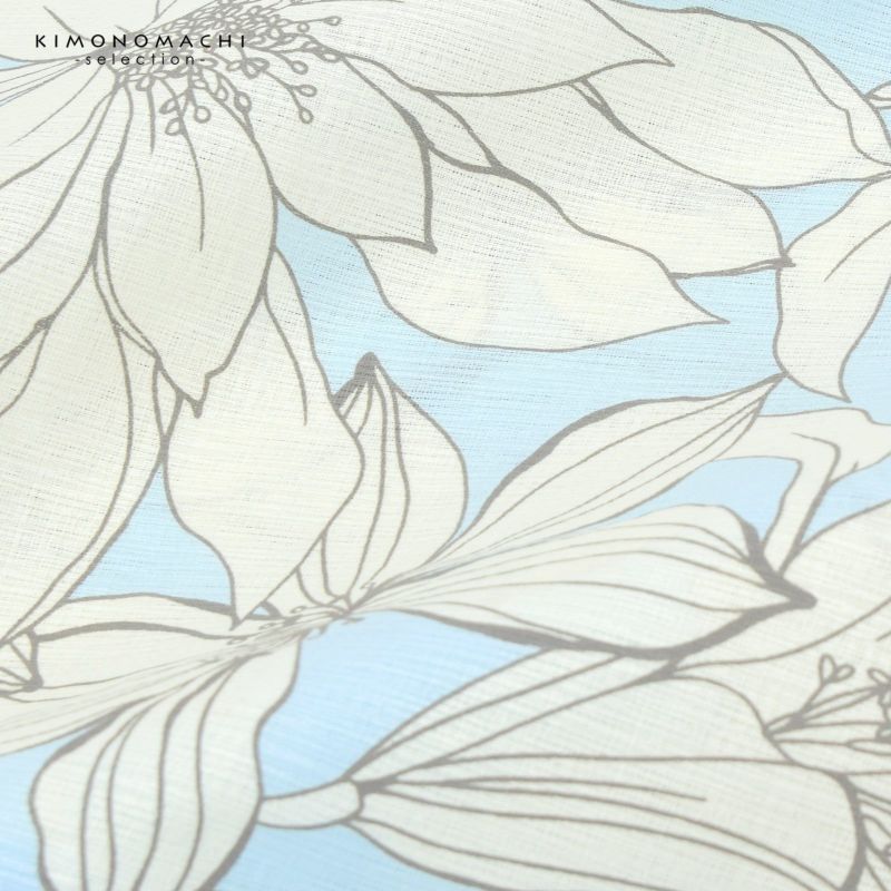 やや灰みの明るい水色の地。チャコールの線で描かれたクリーム色の百合の花々。手描き調の花々がお洒落で、涼し気な色合いの浴衣です。