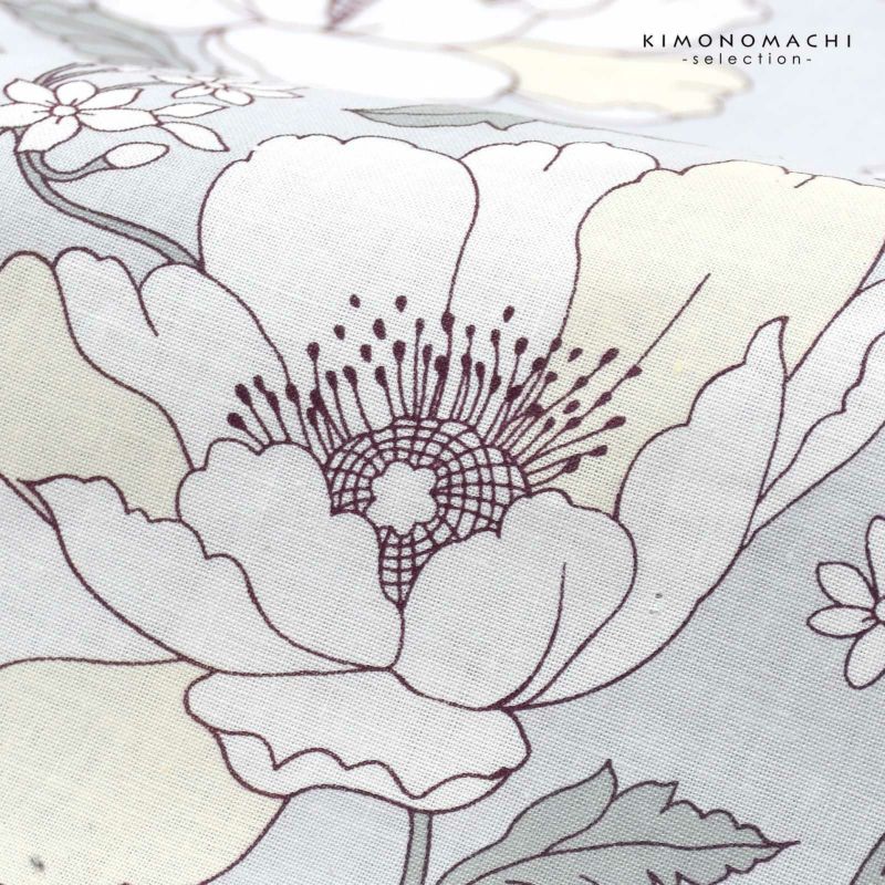 淡いグレーの地に濃茶色の線で描かれたアネモネや小花模様。オフホワイトや薄クリーム色の花びら、グレイッシュな薄緑色の葉。