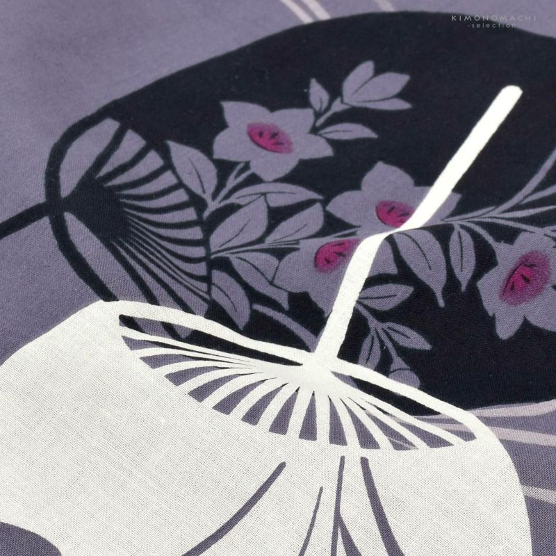 【色柄】やや紫色みのグレーの地。淡いグレーの流水に、黒と白の団扇が流れるように配置されています。団扇には赤紫の挿し色の入った菊や萩、ススキなどの秋草の柄。