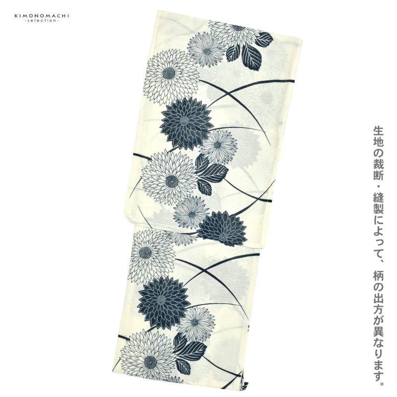 【色柄】淡いクリーム色地に錆びた色みのグレイッシュな藍色で表現された芝草に八重菊の花。流れるような花の配置が動きと華やかさを演出します。