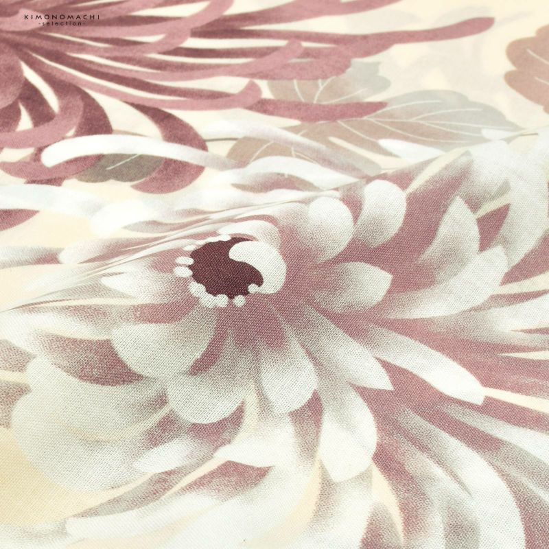【色柄】やや赤みのクリーム色地にグレイッシュな淡い赤紫色、グレー、くすみピンクや白の菊の花。繊細なぼかしのくすみカラーが今っぽいデザインです。