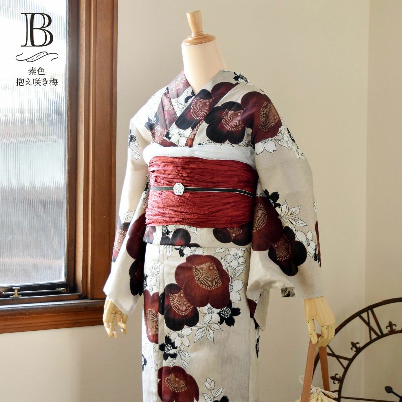 B素色 抱え咲き梅…織りで表現された乱調の縦縞の地。灰みのベージュ地に、流れるように配置された白と黒の桜の花。臙脂色と黒紅色のぼかしの大輪の梅の花が散らされています。白茶の蕊を抱えるような花の形が他にはないデザインです。