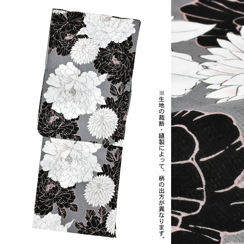 Cグレー 牡丹…織りで表現された乱調の縦縞の地。やや青みのグレー地に、黒い輪郭線に白、ピンクの輪郭線に黒の配色の大輪の牡丹とダリア。花びらにほんのり挿された淡いピンクが奥行きを添えます。