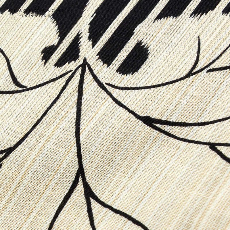 【色柄】白と生成り色が交じり合った生地。シックな墨黒の滝縞に大きな蕗の葉。