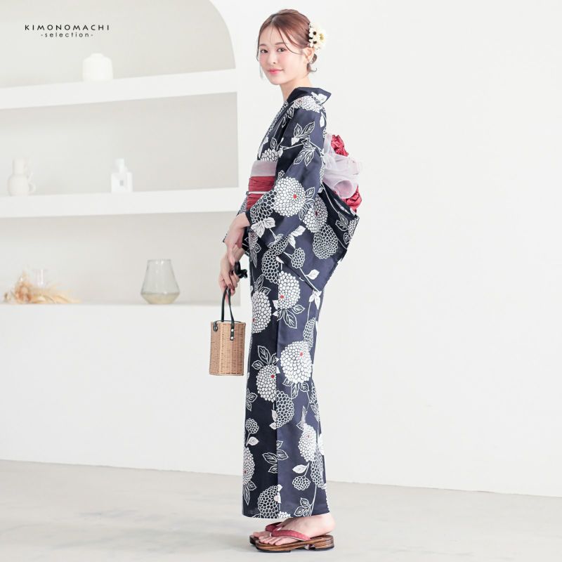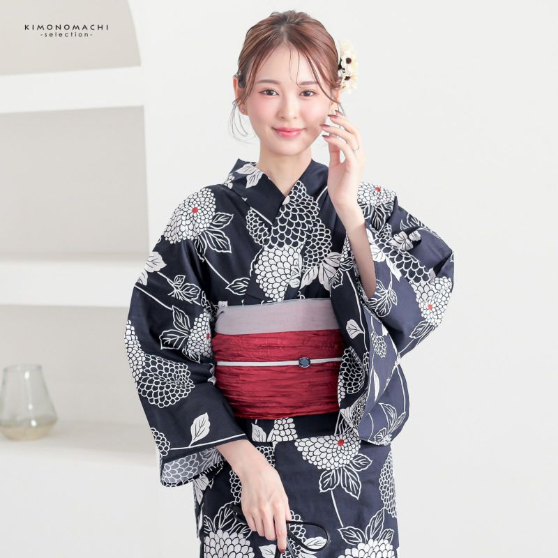 【色柄】濃紺の地に白の鞠のように丸い菊の花。縦に伸びた茎と葉。蕊の赤と薄桃色がアクセント。