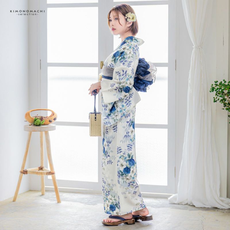 浴衣 レディース 女性浴衣単品「白地 バラに百合、ブーケ」Fサイズ ポリエステル浴衣 プレタ浴衣 お仕立て上がり浴衣 大人浴衣 女性用 女性浴衣 ゆかた【メール便不可】