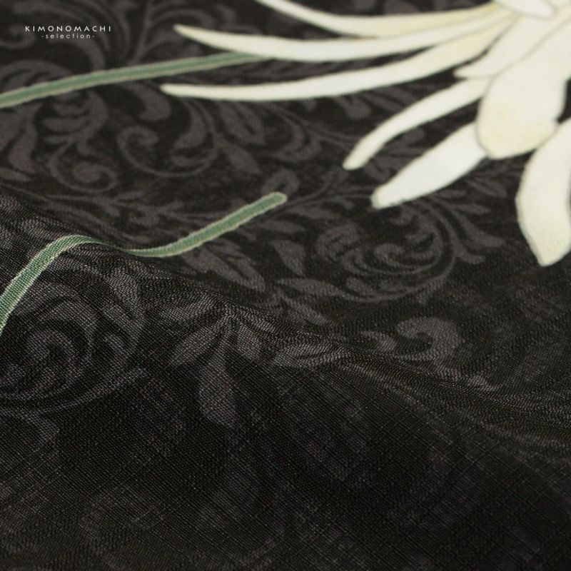 【色柄】織りで表現された縦縞の黒地にグレーのアラベスク模様。アイボリーに淡いぼかしの入ったダリアの花が縦向きに配置されています。
