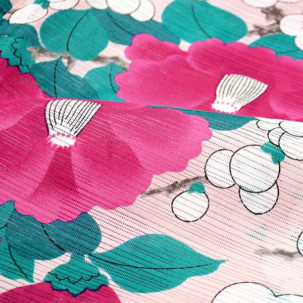 【色柄】淡いピンクの地に赤紫のぼかしの椿の花、ピーコックグリーンの葉に、白く丸いデザインの梅の花がかわいらしく現代的な印象