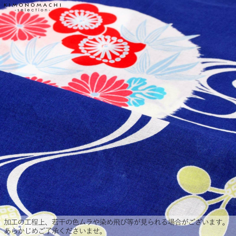 【カラー】あざやかな青地に、白の流水模様、明るい黄緑の萩の葉。白の丸の中に、深い桃色や赤、水色の菊や梅、竹。