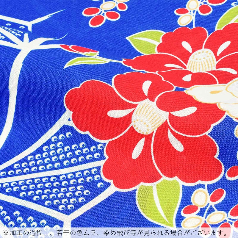 【カラー】青地に白の麻の葉模様。赤や浅い橙に白、黄緑の椿。