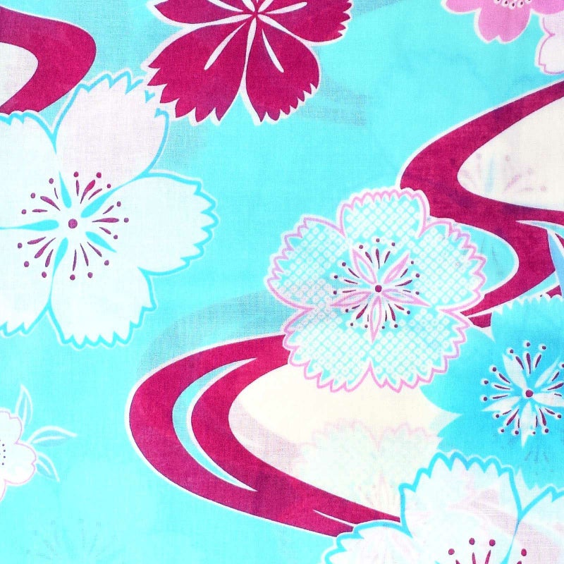 【カラー】深い赤紫の流水模様。流水の曲線で区切られたオフホワイトと水色の地。白と水色、深い赤紫や浅いピンクの撫子や桜の花。浅いブルーの葉。