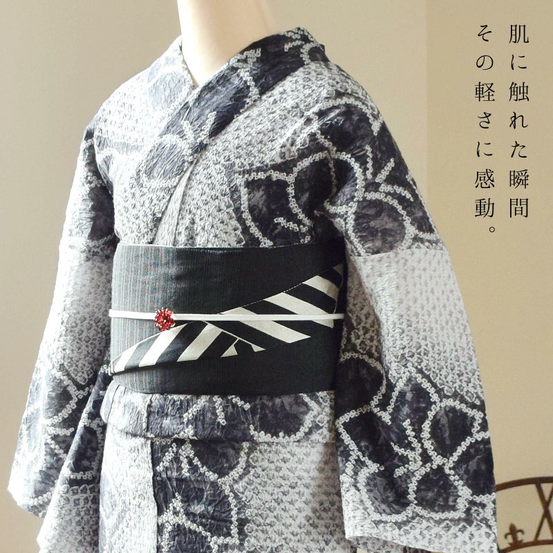 大人のお洒落な絞りの浴衣単品です。お仕立て上がりなので、すぐにご着用いただけます。絞りがやわらかで肌触りがよく、生地の凹凸があることで、肌にはり付きにくく、さわやかな着心地です。盆踊り、夏祭りにはもちろん、襦袢を合わせてちょっとしたお出かけにも、踊りなどのお稽古にもいいですね。