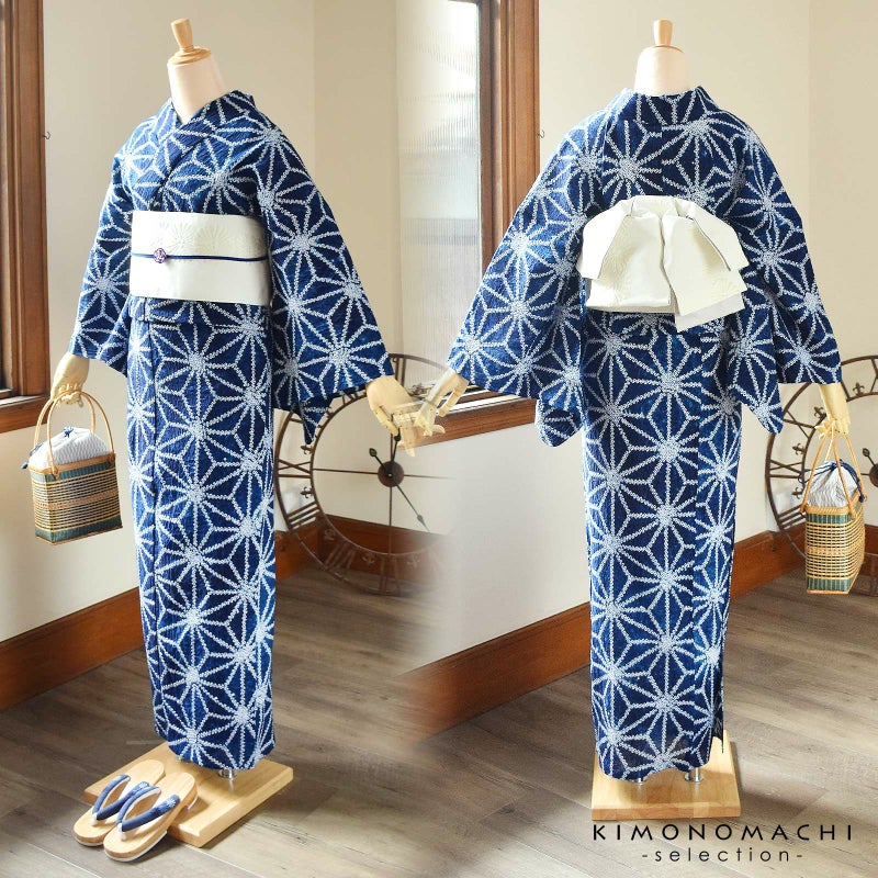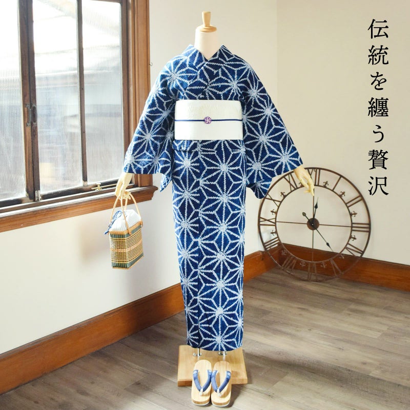 【カラー】深い紺や藍色に白。細かな鹿の子を繋げて表現された麻の葉模様。古典的な魅力のある柄です。