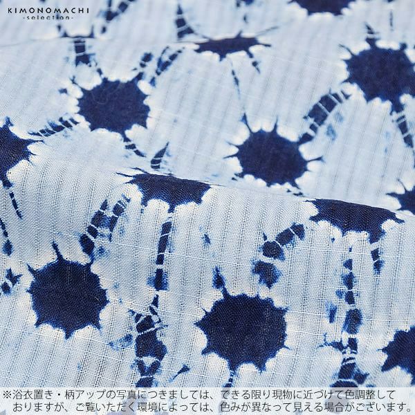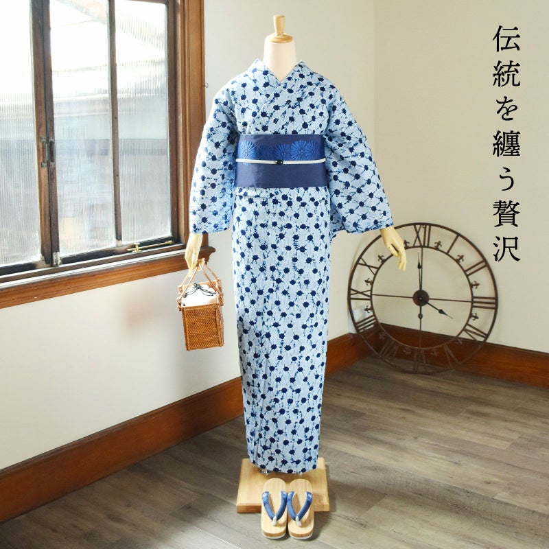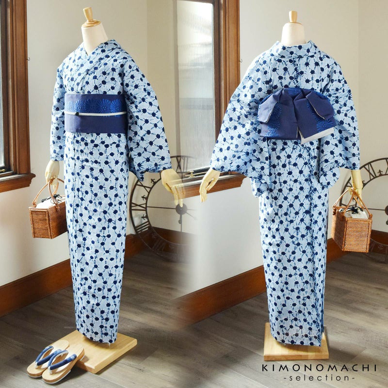 【カラー】濃い紺色、少しくすんだ水色。定番の浴衣らしい色合い。シンプルなので、帯合わせも楽しめ、流行にとらわれず、長くご愛用いただける浴衣です。