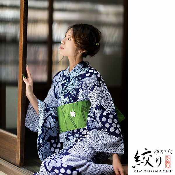 お仕立て上がり絞り浴衣単品「紺色 葡萄」有松絞り 女性浴衣 レディース 綿 お仕立て上がり浴衣