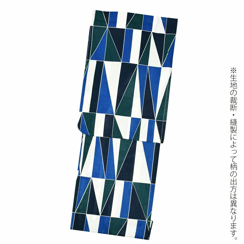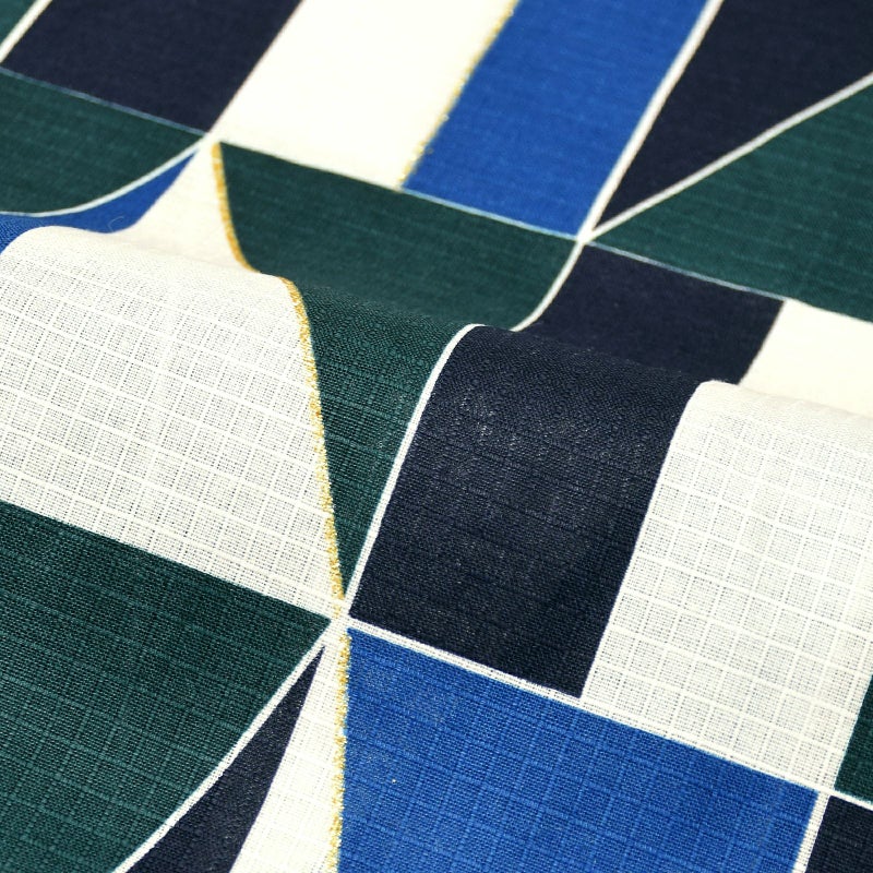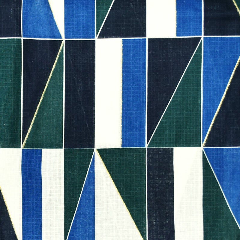 【色柄】白地に深い紺、ブルーや深緑色の三角の幾何学模様。ところどころに引かれた金色のラインがキリっとシャープな印象。