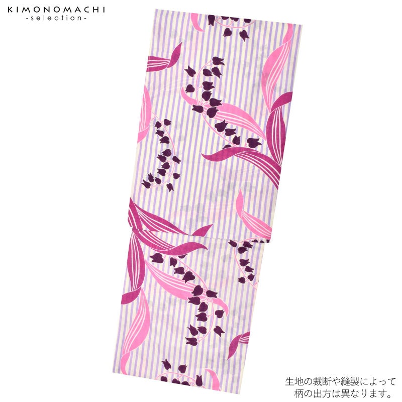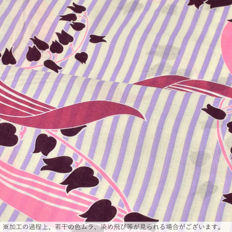 オフホワイトと淡い藤色のストライプの地に、抽象的なスズランの模様。ピンクや赤紫の葉、濃紫の花。