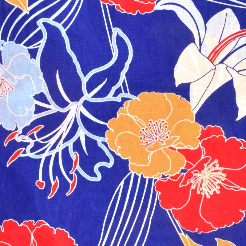 あざやかな青地に、白の輪郭線の百合やマツバボタンの花模様。赤や山吹色、ライトブルーなど。
