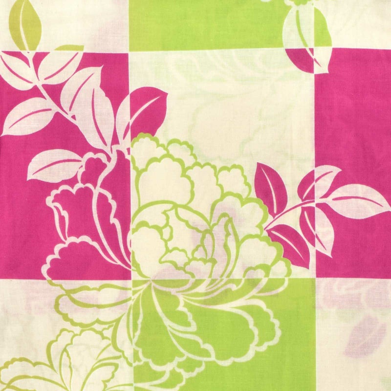 淡いクリーム色と赤紫、黄緑色の長方形の市松模様。同色のラインで表現された牡丹の花模様。