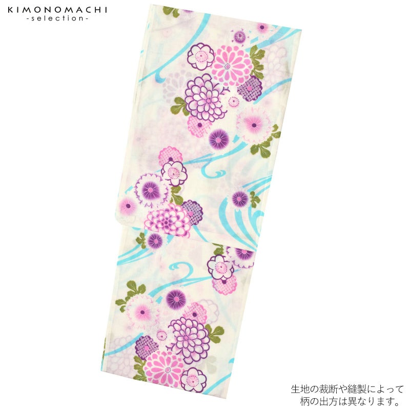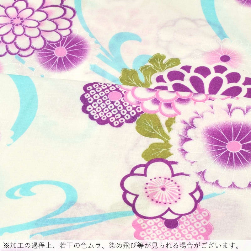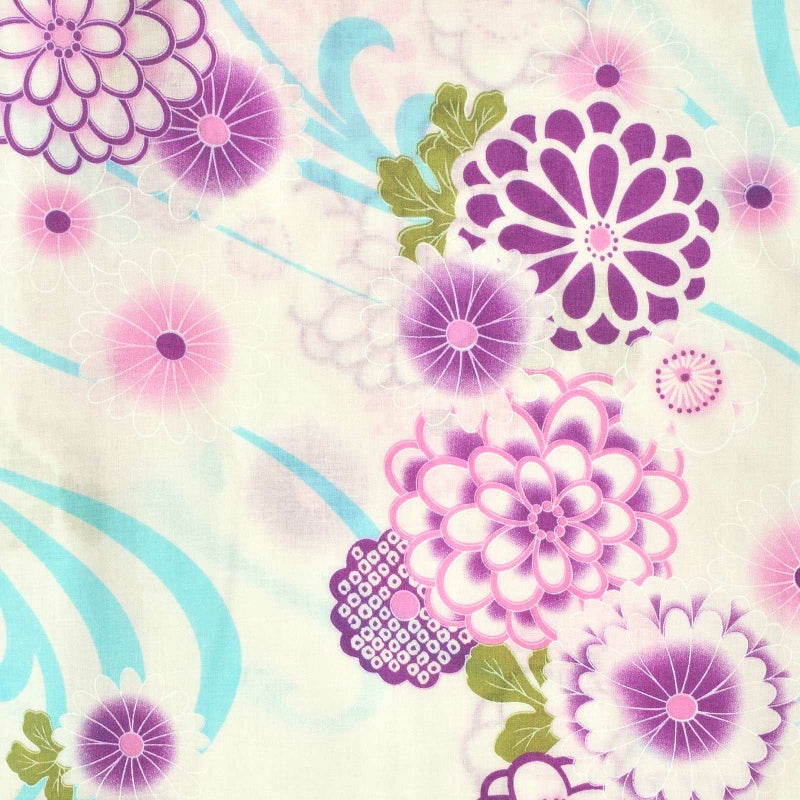 白地に、明るい水色の流水。ピンク、淡い紫を基調とした菊花や梅などの柄。浅い緑の葉。