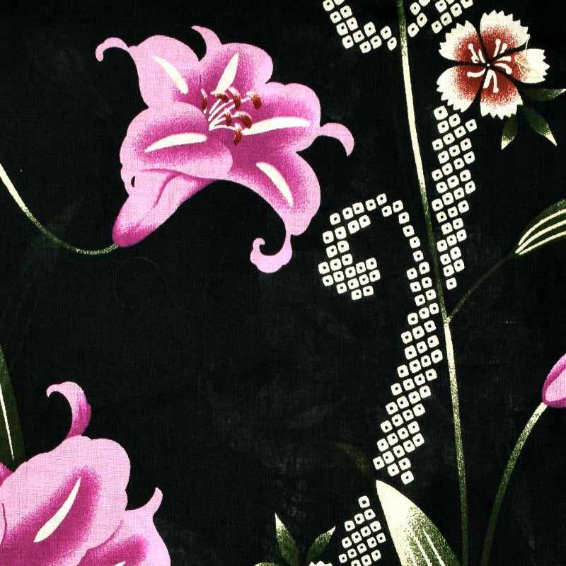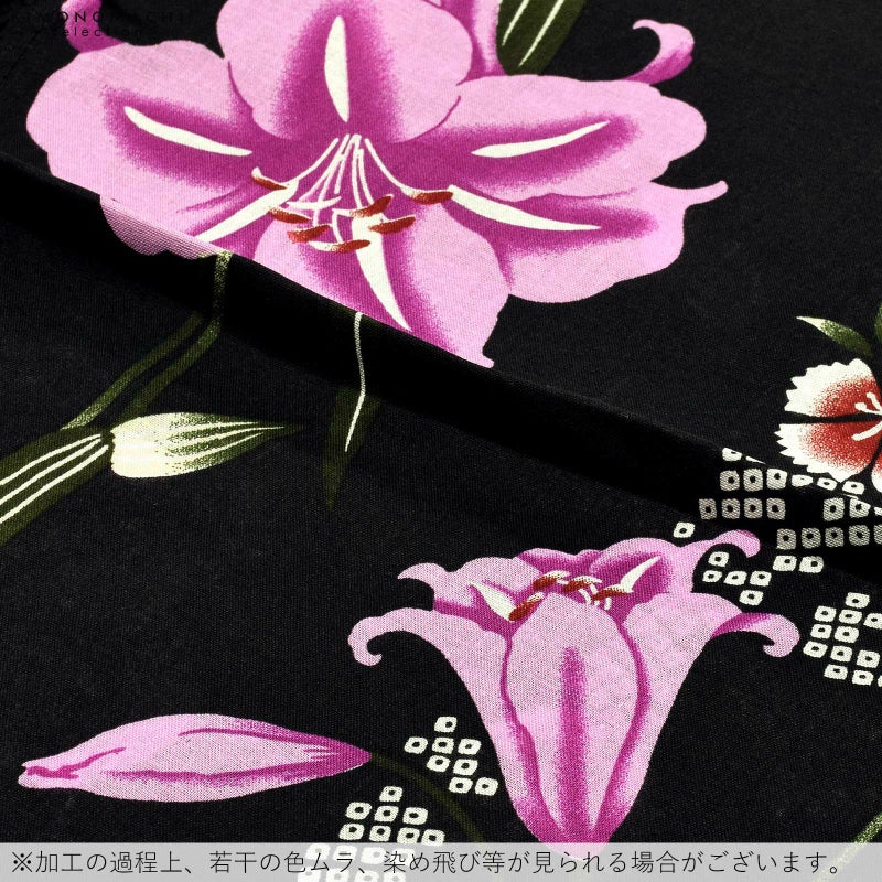 黒地。白の鹿の子で唐草が表現された地に、縦に配置された百合の模様。撫子の花紋。赤紫色と淡い紅紫、深い抹茶色、浅い生成り色、臙脂色など。
