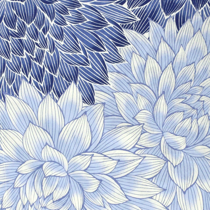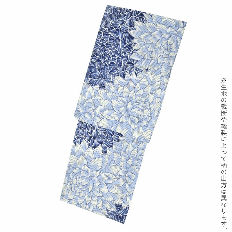 【カラー】やわらかい白地に、淡いブルー、紺色の大輪のダリアの花が、全体に表現されています。涼しげな色と、大胆なデザインが夏らしい浴衣です。